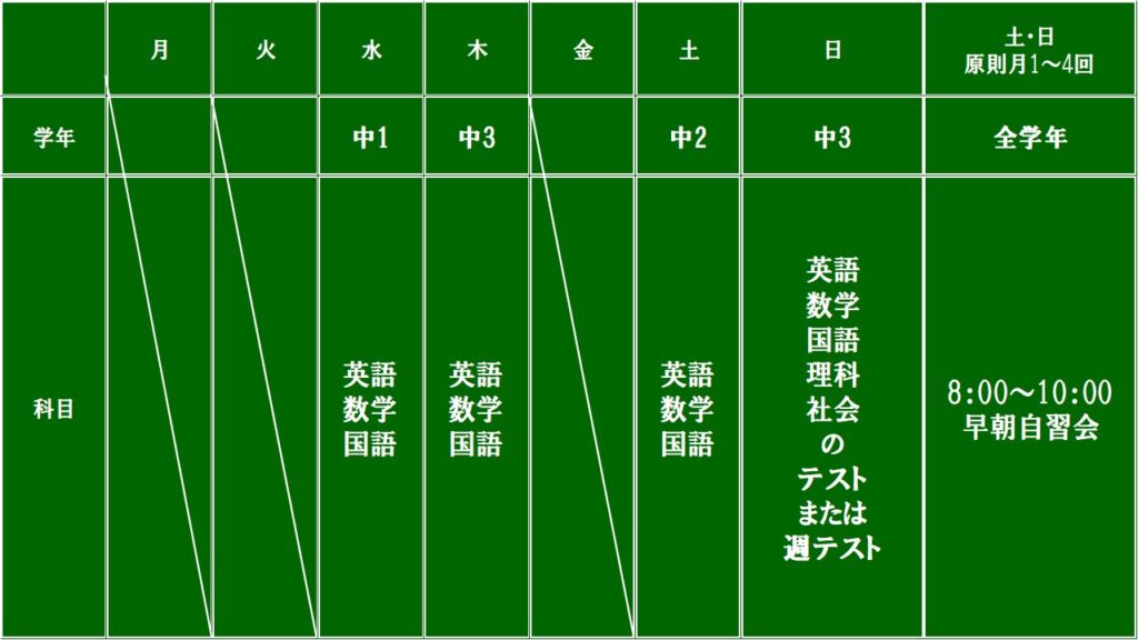 ※中3生は月に2回週テスト実施(短時間)。その日の授業は変則的。
